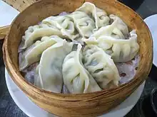 | _%E2%80%93_1.jpg.webp)  Jiǎozi cuits à la vapeur (zhēngjiǎo) dans un cuiseur vapeur en bambou. | |