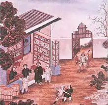 Enfin, de nombreuses pièces étaient fabriquées à Jingdezhen « en blanc », ou partiellement décorées, pour être achevées à Canton, ornées de sujets qui pouvaient être totalement européens : personnages occidentaux en costumes du XVIIIe siècle, inscriptions en alphabet latin, armoiries, etc.[8]