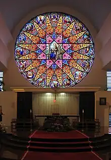 - Holy Family Church à Singapour - La Sainte Famille - (1998) 50 m2 Vitrail de type Saint-Sulpicien. Rose de 8 mètres de diamètre. Church of the Holy Family, Singapor