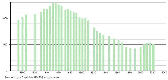 L'évolution du nombre d'habitants est connue à travers les recensements de la population effectués dans la commune depuis 1793. Pour les communes de moins de 10 000 habitants, une enquête de recensement portant sur toute la population est réalisée tous les cinq ans, les populations légales des années intermédiaires étant quant à elles estimées par interpolation ou extrapolation[15]. Pour la commune, le premier recensement exhaustif entrant dans le cadre du nouveau dispositif a été réalisé en 2005[16].