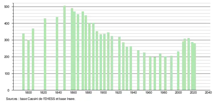 L'évolution du nombre d'habitants est connue à travers les recensements de la population effectués dans la commune depuis 1793. Pour les communes de moins de 10 000 habitants, une enquête de recensement portant sur toute la population est réalisée tous les cinq ans, les populations légales des années intermédiaires étant quant à elles estimées par interpolation ou extrapolation[16]. Pour la commune, le premier recensement exhaustif entrant dans le cadre du nouveau dispositif a été réalisé en 2008[17].
