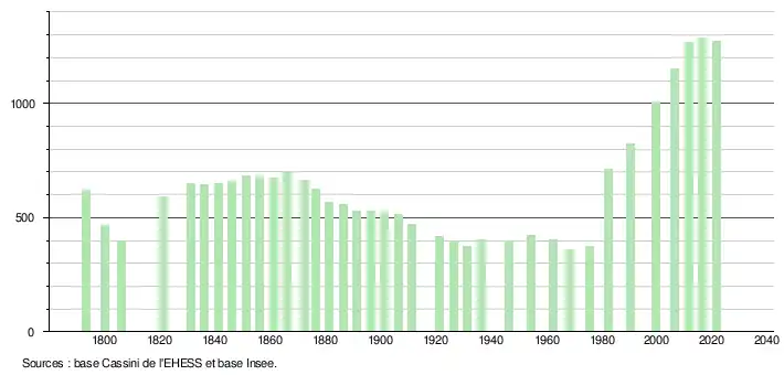 L'évolution du nombre d'habitants est connue à travers les recensements de la population effectués dans la commune depuis 1793. Pour les communes de moins de 10 000 habitants, une enquête de recensement portant sur toute la population est réalisée tous les cinq ans, les populations légales des années intermédiaires étant quant à elles estimées par interpolation ou extrapolation[27]. Pour la commune, le premier recensement exhaustif entrant dans le cadre du nouveau dispositif a été réalisé en 2006[28].