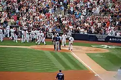 Les joueurs des Yankees félicitent Derek Jeter pour son 3000e coup sûr, le 9 juillet 2011.