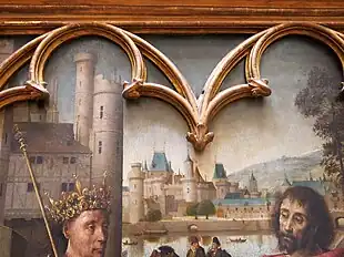 Vue d'artiste (à l'arrière-plan) de Paris au XVe siècle : on distingue la tour de Nesle, le Palais du Louvre et l'hôtel de Bourbon.