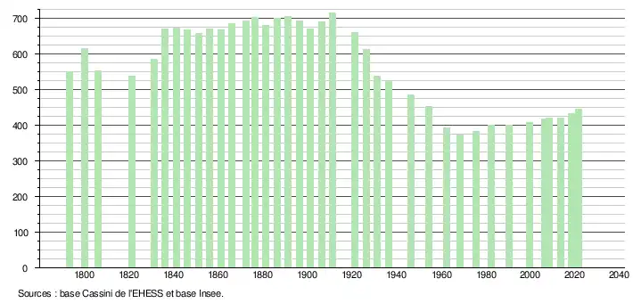 L'évolution du nombre d'habitants est connue à travers les recensements de la population effectués dans la commune depuis 1793. Pour les communes de moins de 10 000 habitants, une enquête de recensement portant sur toute la population est réalisée tous les cinq ans, les populations légales des années intermédiaires étant quant à elles estimées par interpolation ou extrapolation[18]. Pour la commune, le premier recensement exhaustif entrant dans le cadre du nouveau dispositif a été réalisé en 2008[19].