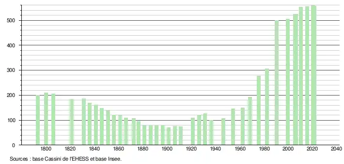 L'évolution du nombre d'habitants est connue à travers les recensements de la population effectués dans la commune depuis 1793. Pour les communes de moins de 10 000 habitants, une enquête de recensement portant sur toute la population est réalisée tous les cinq ans, les populations légales des années intermédiaires étant quant à elles estimées par interpolation ou extrapolation[22]. Pour la commune, le premier recensement exhaustif entrant dans le cadre du nouveau dispositif a été réalisé en 2005[23].
