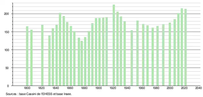 L'évolution du nombre d'habitants est connue à travers les recensements de la population effectués dans la commune depuis 1800. Pour les communes de moins de 10 000 habitants, une enquête de recensement portant sur toute la population est réalisée tous les cinq ans, les populations légales des années intermédiaires étant quant à elles estimées par interpolation ou extrapolation[17]. Pour la commune, le premier recensement exhaustif entrant dans le cadre du nouveau dispositif a été réalisé en 2006[18].