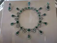 La parure d'émeraude de l'impératrice Marie-Louise, composée d'un diadème, d'un collier, d'une paire de boucles d'oreilles, et d'un peigne, avait été commandée pour le mariage de l'empereur avec l'archiduchesse au joaillier François-Regnault Nitot. Elle est emportée par l'impératrice après la chute de l'Empire. A sa mort en 1847, elle les lègue à son cousin Léopold II de Toscane. La parure reste dans la famille Habsbourg jusqu'en 1953, date à laquelle elle est revendue à la maison Van Cleef & Arpels. Les émeraudes du diadème sont alors vendues une à une par le joaillier, qui les remplace par des turquoises. La femme d'affaires américaine Marjorie Merriweather Post le rachète à la fin des années 50 et le lègue à la Smithsonian Institution en 1966, où il rejoint deux autres joyaux entreposés là-bas : le collier de diamants offert par Napoléon à Marie-Louise (également légué par Merriweather Post) à l'occasion de la naissance de leur fils, ainsi que le diamant Hope. Le peigne est transformé et on perd sa trace après les années 1960. Le collier et la paire de boucles d'oreilles sont cependant préservés dans leur état d'origine et rejoignent les collections du musée du Louvre en 2004 grâce au fonds du Patrimoine, à la Société des Amis du Louvre et la direction du musée[24].