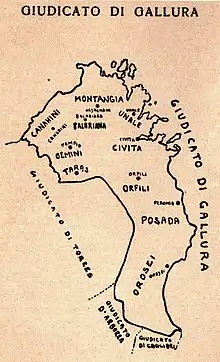 Le Judicat de Gallura est uni à celui du Logudoro en 1238 puis redevient indépendant en 1257 avec Chiano Visconti de Pise. Au début du XIVe siècle la famille Doria de Gènes s'en rend maître. Les Visconti de Milan proclament les droits qu'ils prétendent tenir en qualité d'héritiers de Giovanna Visconti la dernière « Juge héréditaire »mais ils doivent les céder au royaume d'Aragon en 1447[1].
