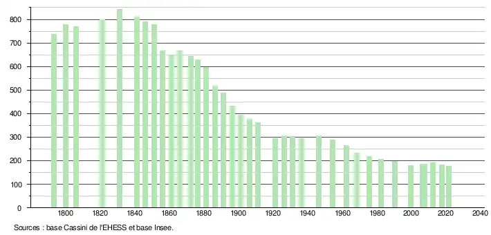 L'évolution du nombre d'habitants est connue à travers les recensements de la population effectués dans la commune depuis 1793. Pour les communes de moins de 10 000 habitants, une enquête de recensement portant sur toute la population est réalisée tous les cinq ans, les populations légales des années intermédiaires étant quant à elles estimées par interpolation ou extrapolation[26]. Pour la commune, le premier recensement exhaustif entrant dans le cadre du nouveau dispositif a été réalisé en 2007[27].