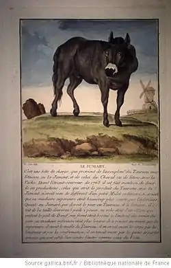 « LE JUMART. C'est une bête de charge, qui provient de l'accouplement du Taureau avec l'Ânesse, ou la Jument, et de celui du Cheval ou de l'Âne avec la Vache. »