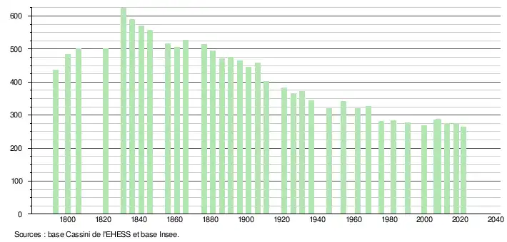 L'évolution du nombre d'habitants est connue à travers les recensements de la population effectués dans la commune depuis 1793. Pour les communes de moins de 10 000 habitants, une enquête de recensement portant sur toute la population est réalisée tous les cinq ans, les populations légales des années intermédiaires étant quant à elles estimées par interpolation ou extrapolation[19]. Pour la commune, le premier recensement exhaustif entrant dans le cadre du nouveau dispositif a été réalisé en 2007[20].