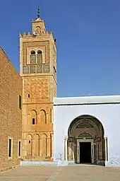 Selon une inscription ultérieure, la maqsura a été restaurée en 1624[42],[43]. La détermination de la direction pour la prière remonte au VIIe siècle et s'écarte de 31° par rapport à l'orientation exacte ; la qibla n'a pas été modifiée lors de l'ornementation en marbre de la niche d'origine par les Aghlabides[44]. Le minaret, massif et agrandi à deux reprises, atteint désormais trois étages, dont le dernier est coiffé d'une coupole côtelée, et se dresse face à la salle de prière, au milieu du portique nord de la cour. Sa forme tire son origine d'une tour de défense dotée de postes de tir. À l'origine, la mosquée n'avait aucun minaret et son édification remonte au temps du calife omeyyade Hicham ben Abd al-Malik (724-743). Il est de ce fait antérieur d'une centaine d'années à l'aménagement de la salle de prière qui lui fait face et qui date de Ziadet Allah Ier[45],[46]. Datant du VIIIe – IXe siècle, ce minaret est le plus ancien au monde qui soit toujours debout[47].