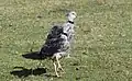 C'est un oiseau de grande taille, environ 75 cm du bec à la queue, qui ressemble à une espèce de paon avec une crête, un petit bec et un collier de plumes claires au cou. Les pattes sont robustes et longues, de couleur rosée ; la région des yeux est rosée. Il est capable de voler très haut pendant plusieurs heures, mais c'est également un très bon marcheur et nageur.
