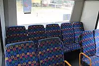 * = variable selon l'aménagement intérieur. | L'entrée et la sortie se font à l'aide d'une paire de portes à double battant de 83 cm de large ; la première est située dans le porte-à-faux avant du bus, la seconde est placée dans l'empattement près de l'essieu arrière. Les sièges sont en tissus et pour les passagers, sont disposés en deux rangés de deux sur toute la longueur du car et sont fixés sur une marche d'une hauteur de 20 cm. Sur les premiers véhicules fabriqué, la banquette arrière disposait de quatre sièges, puis un cinquième sera ajouté quelque temps après ; pour les modèles à arrière plat, trois banquette de deux sièges ont pu être ajoutés. Contrairement au C 934, ce modèle ne dispose pas d'emplacement vide pour une poussette ou autres encombrants ni de racks à bagages. Les soutes ont un volume de 5 m3 et sont situées sous le plancher dans l'empattement. L'intérieur est éclairé par six blocs lumineux avec la possibilité d'alterner entre un éclairage vif ou tamisé pour les voyages de nuit. Les marches sont également éclairés lors de l'ouverture des portes.  C 935.1034 Récréo d'avant 1999. |