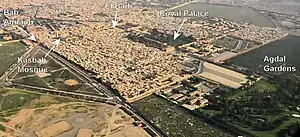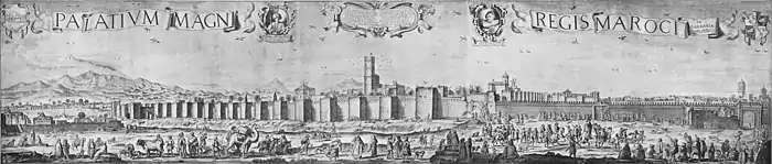 Lorsque le souverain almohade Abd al-Mumin a conquis Marrakech en 1147, il aurait détruit de nombreux monuments almoravides (en particulier des mosquées), mais le Ksar el-Hajjar et le palais d'Ali ben Youssef étaient toujours utilisés comme résidence officielle des nouveaux dirigeants almohades pendant un certain temps[3],[2]. Le calife almohade Ya'qub al-Mansur (régnant de 1184 à 1199), s'est cependant lancé dans un projet de construction ambitieux pour créer une vaste nouvelle kasbah royale au sud de la ville. La construction a débuté en 1185 et s'est achevée en 1190, bien que ses successeurs aient probablement poursuivi la construction par étape ensuite. La kasbah était un vaste quartier autonome entouré de remparts extérieurs et subdivisé en son sein par des murs défensifs. Il comprenait non seulement le palais royal, mais également sa propre grande mosquée (la mosquée de la Kasbah ), ses propres marchés et qaysariyya (galerie commerciale), ses bains publics (hammam), ses entrepôts, écuries, cimetières, parcs, places et peut-être même un hôpital (maristan). Les Almohades ont également établi de vastes jardins d'agrément autour de la kasbah, dont les plus vastes sont les jardins d'Agdal au sud qui étaient entourés de leurs propres murs.