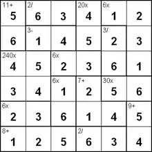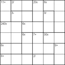 La grille est constituée d'un nombre égal de lignes et de colonnes contenant des blocs de deux ou trois cases délimitées par un épais trait noir. Le chiffre inscrit en haut à gauche de chaque bloc est le résultat de l'opération (addition, soustraction, multiplication, division) effectuée avec les chiffres des deux ou trois cases d'un même bloc.