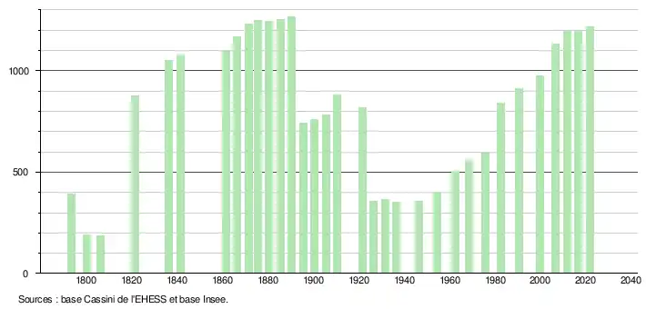 L'évolution du nombre d'habitants est connue à travers les recensements de la population effectués dans la commune depuis 1793. Pour les communes de moins de 10 000 habitants, une enquête de recensement portant sur toute la population est réalisée tous les cinq ans, les populations légales des années intermédiaires étant quant à elles estimées par interpolation ou extrapolation[24]. Pour la commune, le premier recensement exhaustif entrant dans le cadre du nouveau dispositif a été réalisé en 2006[25].
