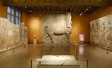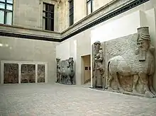 Les sculptures ornant les murs du palais de Dur-Sharrukin font partie des plus belles réalisations de l'art assyrien. Elles témoignent d'une remarquable intégration dans l'organisation spatiale du palais. Les portes extérieures et intérieurs étaient gardées par des statues monumentales de taureaux androcéphales ailés (et aucun lion androcéphale, comme on en a trouvé à Nimroud), qui avaient une fonction protectrice : ils représentent des génies que les textes assyriens désignent par les termes šēdu, lamassu ou aladlammu. Ils étaient disposés par paires symétriques de chaque côté des voies d'accès et soutenaient la voûte des portes. L'entrée de la cour XV, de la salle du trône et la cour III disposaient de deux paires, parce qu'elles étaient considérées comme des points plus importants du palais. Comme cela a été évoqué, leur réalisation dans des blocs de pierre unique et leur transport dans la ville depuis les carrières était très suivi par le roi qui portait manifestement un intérêt particulier à ces statues. Elles sont toutes réalisées suivant les mêmes proportions, avec la même exécution : tête humaine en ronde-bosse, corps en haut-relief avec une barbe, des ailes et un pelage finement taillés[55]. Les dimensions varient cependant : entre 3,5 et 5,8 mètres de haut pour environ 1,3 de large.