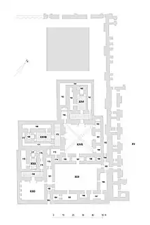 Le palais royal (« Palais sans égal », é-gal-gaba-ri-nu-tuku-a en sumérien, employé pour les noms cérémoniels) était divisé, comme les palais assyriens érigés auparavant à Nimroud, entre deux ensembles : un secteur officiel, le babanu, destiné aux activités administratives et à la vie publique de la cour ; un secteur privé, bītanu, servant de résidence pour la famille royale, dont l'accès était strictement contrôlé[51]. Mais le complexe palatial est ici plus vaste que dans les palais de Nimroud : les éléments typiques des palais néo-assyriens organisé en deux parties sont concentrés dans la partie nord autour de la salle du trône et des cours VI et VIII ; la partie sud de l'édifice autour de la vaste cour d'entrée (XV) est une extension par rapport aux palais précédents et reflèterait le fait qu'il y a plus de suites dédiées à l’appareil d’État, qu'il a fallu regrouper dans un nouveau secteur, ce qui a abouti à un palais bien plus complexe que ses prédécesseurs[52].