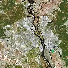 Centre de Kiev avec ses îles sur le Dniepr et la place Poshtova à gauche.