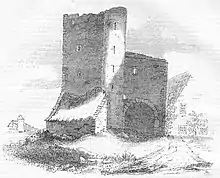 Un donjon a été construit pour renforcer ou remplacer les défenses antérieures au XVe siècle. Cette structure rectangulaire de cinq niveaux contient quatre étages au-dessus d'un sous-sol voûté en berceau avec une deuxième voûte au-dessus du quatrième étage[44],[45]. Il est attenant au sud-ouest à une guérite et était à l'origine attenant à un mur défensif (bawn)[46]. Le Dublin Penny Journal montre une maison à pignons escarpés attenante à la guérite, peut-être de la fin du XVIIe siècle ou du début du XVIIIe siècle[47] Un boulet de canon, datant peut-être du XVIIe siècle, a été récupéré près du château en 1901[48].