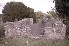 La dernière église, ruinée en 1630 mais restaurée plus tard au XVIIe siècle, était de nouveau tombée en désuétude au début du XVIIIe siècle, lorsque les services protestants ont peut-être déménagé dans la paroisse adjacente de Rathmore[28],[29],[30]. En 1935, des fragments décorés de l'arc du choeur ont été récupérés dans une ferme attenante au château et rétablis par Harold G. Leask[31],[32].