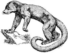 - Quelques mois auparavant, en 1773, à l'occasion de l'édition de corrections et addendas aux Quadrupèdes de son Histoire naturelle, Buffon observe dans une ménagerie foraine installée à Saint-Germain-en-Laye un animal présenté comme une « belette mexicaine »[139] inconnue[140] et dont il retrouve un exemplaire trois ans plus tard, en 1776, chez un particulier qui le prenait pour un agouti ou un coati. C'est Buffon lui-même qui dans la description très complète qu'il publie[141] la même année le baptise kinkajou tout en y distinguant une espèce différente, originaire de Nouvelle-Espagne, de son homonyme canadien[142] auquel il réserve désormais le nom de carcajou[143]. Il indique son nom de poto[note 13] qui l'apparente aux lémuriens mais le rapproche des viverridés[144], fantaisie confortée par Gmelin, lequel invente en 1789 le taxon de Viverra caudivolvula[145], c'est-à-dire à « queue préhensile », pour désigner le même animal, et qui sera soutenue par certains jusqu'en 1943.