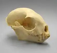 | Les trente-six dents se répartissent par demi maxillaires en trois incisives, une canine, trois prémolaires et deux molaires. Un espace libre après la dernière incisive du haut et avant la première prémolaire du bas laisse la grosse canine opposée se glisser le long de la gencive, celle du haut croisant celle du bas derrière celle-ci, la rendant plus apparente et plus menaçante alors qu'elle est en fait plus longue de deux centimètres[9] (12,6 mm pour les mâles, 11,2 pour les femelles)[9] mais plus fine. La denture est celle d'une manducation par écrasement plus que par mastication. Canines et premières prémolaires servent à ouvrir fruits et gousses indéhiscents[16]. Seule la dernière prémolaire du haut et la première du bas sont franchement rectangulaires comme les molaires, la dernière de celles-ci, plus petite, l'étant moins[17]. Cette caractéristique anatomique de carnivore correspond de façon encore plus paradoxale pour un frugivore à un intestin adapté à la seule digestion des viandes et dépourvu de cæcum[18]. |