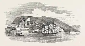 ![]() Le HMS Miranda détruisant la ville de Kola pendant la guerre de Crimée, en 1854. |