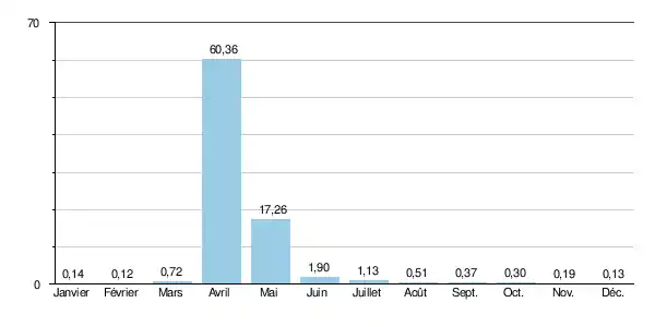 Les hautes eaux se déroulent brusquement en avril, et correspondent à la fonte des neiges. Dès le mois de mai, le débit de la rivière baisse fortement puis s'effondre rapidement, ce qui mène à la saison des basses eaux qui a lieu le restant de l'année, de juin à mars inclus, et durant laquelle les débits mensuels sont souvent minimes. Le débit moyen mensuel observé en janvier (minimum d'étiage) atteint 0,12 m3/s, soit moins de 1 % du débit moyen du mois d'avril (60,36 m3/s), ce qui montre l'extrême amplitude des variations saisonnières. Sur la période d'observation de 36 ans, le débit mensuel minimal a été fréquemment de 0 m3/s (cours d'eau totalement à sec), tandis que le débit mensuel maximal s'est élevé à 255 m3/s (). Ce dernier chiffre est cependant assez exceptionnel.