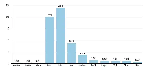 Le débit moyen mensuel observé en mars (minimum d'étiage) est de 0,11 m3/s (110 litres), soit à peine 0,4 % du débit moyen du mois de mai (23,8 m3/s), ce qui témoigne de l'amplitude extrême des variations saisonnières. Sur la durée d'observation de 60 ans, le débit mensuel minimal a été de 0,0 m3/s à de nombreuses reprises durant les mois d'hiver (cours d'eau totalement gelé), tandis que le débit mensuel maximal s'élevait à 92,5 m3/s ().