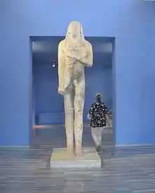 ![]() Kouros colossal du cap Sounion. Marbre, H. 3,05 m. Très peu après 600. Musée national archéologique d'Athènes[7] |