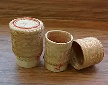 Un cône en bambou tressé, appelé huad, est utilisé pour cuire le riz gluant à la vapeur. Une fois cuit, le riz est étalé dans un kradong (panier à riz) pour refroidir avant d'être placé dans un kratip. Le kratip permet de garder le riz au chaud[2]
