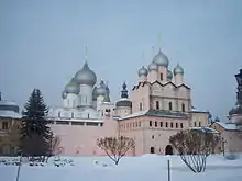La résidence du métropolite fut construite selon un plan de kremlin, bien qu'à la fin du XVIIe siècle, l'ère des « kremlins » fut déjà dépassée[2]. Les hauts murs d'enceinte avaient une fonction esthétique, religieuse, autant que de défense. Tous les bâtiments sont caractérisés par l'union de l'architecture religieuse et de l'architecture civile et militaire. Beaucoup de grands monastères russes, tels ceux de Laure de la Trinité-Saint-Serge, le Monastère Solovetski dans la Mer Blanche sont des forteresses dont les murs épais pouvaient soutenir un siège . Cette association d'architecture religieuse et militaire assure à ces constructions une grande originalité. C'étaient de véritables forteresses ecclésiastiques, monastiques, des citadelles de la foi orthodoxe, hérissées de tours de guet et de défenses.