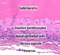 - Petites cellules épithéliales basales cuboïdes, foncés, disposées en palissade, sans pont intercellulaire distinct. - Capsule fibreuse.Il n'y a pas de couche cellulaire granuleuse (contrairement à un kyste épidermique).