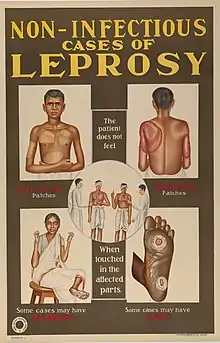 La lèpre est l'une des rares maladies qui présente des lésions dermatologiques avec troubles neurologiques (troubles de la sensibilité cutanée). Elle se distingue aussi par des signes négatifs : absence de prurit, de squames et de vésicules[42].