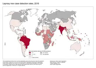 En 2016, l’Organisation mondiale de la santé recensait 216 108 nouveaux cas de lèpre dans le monde[36] (la France compte 250 cas déclarés, tous originaires de l'outre-mer ou des zones d’endémie)[37].
