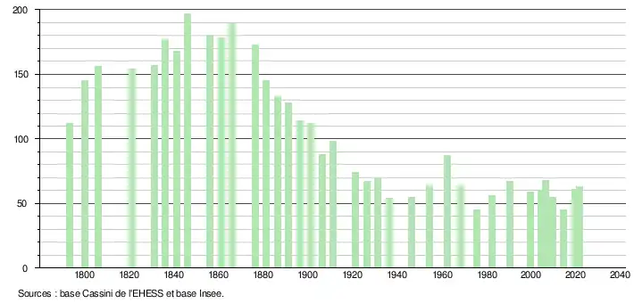 L'évolution du nombre d'habitants est connue à travers les recensements de la population effectués dans la commune depuis 1793. Pour les communes de moins de 10 000 habitants, une enquête de recensement portant sur toute la population est réalisée tous les cinq ans, les populations légales des années intermédiaires étant quant à elles estimées par interpolation ou extrapolation[18]. Pour la commune, le premier recensement exhaustif entrant dans le cadre du nouveau dispositif a été réalisé en 2004[19].