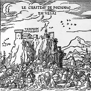 On a longtemps prétendu, et ce depuis la fin du XVe siècle, la faire remonter aux premiers siècles de l'ère gallo-romaine, au temps du paganisme renforçant sa prééminence historique et politique dans la région du Puy-en-Velay. Selon un courant historiographique assez homogène, avant la forteresse féodale de Polignac, il existait sur le rocher un temple d'Apollon et les premiers membres de la famille en étaient les prêtres. L'argument le plus souvent usité pour affirmer cette ascendance mythique est l'appartenance à cette famille, de Sidoine Apollinaire (430-489), évêque de Clermont-Ferrand et poète célèbre, dont les grands-parents étaient païens[3]. D'où, d'après certains chercheurs, les similitudes entre Polignac et Apollinaire voire Apollon, et les constructions sémantiques qui en découlèrent.