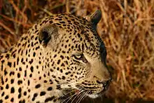 Le Léopard ou la Panthère (Panthera pardus) est une espèce de félins de la sous-famille des panthérinés. Ce félin présente un pelage fauve tacheté de rosettes ; une forme mélanique (la Panthère noire) existe également. Excellent grimpeur et sauteur, le léopard a la particularité de hisser ses proies à la fourche d'un arbre pour les mettre hors de portée des autres prédateurs.