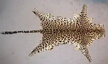 Le pelage du léopard est marqué de taches sur fond jaune pâle à marron chamois. La gorge, la poitrine, le ventre, la face interne des pattes et de la queue sont blancs. Les oreilles arrondies ont le revers noir avec un point blanc à l'intérieur. Sur les flancs, le dos et la partie supérieure des pattes, les taches forment des rosettes dont le cœur est brun et comporte parfois un point noir, comme celles du jaguar. La tête, les membres et la queue comportent des taches pleines noires. Sur la queue, les taches peuvent former des anneaux[2]. La disposition et la forme des taches sont très variables d'un individu à l'autre[2][6]. Dans les régions tropicales, le poil tend à être court et brillant de couleur sombre tandis que dans les régions froides, il est plus long, soyeux et clair. Le léopard de l'Amour est la sous-espèce aux rosettes les plus espacées et au pelage le plus clair. Le léopard d'Arabie a une robe claire et est caractérisé par sa petite taille[7].