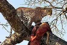 Dans les milieux urbains, le léopard s'attaque aux chiens et au bétail, parfois aux enfants[13]. Les animaux domestiques et d'élevage constituent 25 % de son alimentation en milieux urbanisés[4].