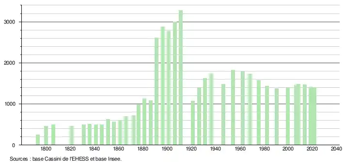 L'évolution du nombre d'habitants est connue à travers les recensements de la population effectués dans la commune depuis 1793. Pour les communes de moins de 10 000 habitants, une enquête de recensement portant sur toute la population est réalisée tous les cinq ans, les populations légales des années intermédiaires étant quant à elles estimées par interpolation ou extrapolation[19]. Pour la commune, le premier recensement exhaustif entrant dans le cadre du nouveau dispositif a été réalisé en 2008[20].