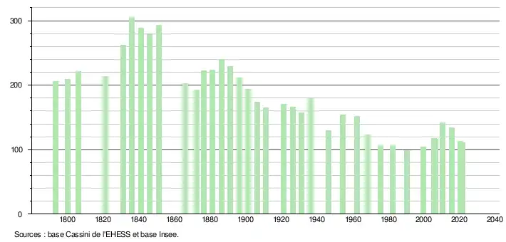 L'évolution du nombre d'habitants est connue à travers les recensements de la population effectués dans la commune depuis 1793. Pour les communes de moins de 10 000 habitants, une enquête de recensement portant sur toute la population est réalisée tous les cinq ans, les populations légales des années intermédiaires étant quant à elles estimées par interpolation ou extrapolation[18]. Pour la commune, le premier recensement exhaustif entrant dans le cadre du nouveau dispositif a été réalisé en 2005[19].
