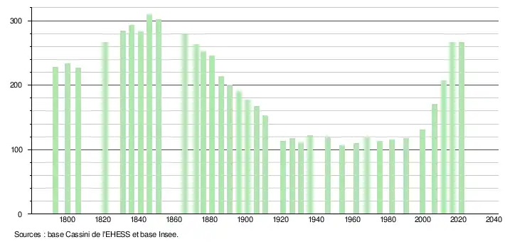 L'évolution du nombre d'habitants est connue à travers les recensements de la population effectués dans la commune depuis 1793. Pour les communes de moins de 10 000 habitants, une enquête de recensement portant sur toute la population est réalisée tous les cinq ans, les populations légales des années intermédiaires étant quant à elles estimées par interpolation ou extrapolation[20]. Pour la commune, le premier recensement exhaustif entrant dans le cadre du nouveau dispositif a été réalisé en 2006[21].