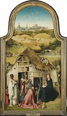 Le retable triptyque de L'Adoration des Mages, commandé par Peeter Scheyve et sa femme Agnes de Gramme en 1495-1499, comprend des éléments uniques dans l’œuvre de Bosch qui sont absents des autres triptyques néerlandais peints à la même époque. Le panneau central représente l'Enfant Jésus dans les bras de la Vierge Marie, en présence des trois Rois mages. La grange délabrée et les personnages inquiétants qui se trouvent à l'intérieur symbolisent l'imminence du danger. Deux paysans sont sur le toit et regardent la scène ; d'autres essayent de jeter un œil à travers les ouvertures situées dans les murs de la grange ou en montant au sommet des arbres environnants. Au deuxième plan, une scène de bataille ; des hommes montés à cheval s'élancent depuis la droite et la gauche, dans ce qui semble être le prélude d'un combat. Au loin, un troisième groupe de cavaliers se dirige vers la ville. À l'arrière plan, on distingue la ville de Jérusalem avec en son centre un moulin à vent, un symbole récurrent dans l’œuvre de Bosch.