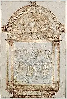 Le musée Condé de Chantilly conserve le dessin à la plume et encre brune, légèrement aquarellée aux tons bruns, rouge, vert et bleu (39 × 26,5 cm, DE 887) de cet extraordinaire projet dans sa globalité. Il s'agit aussi du modello le plus précoce de la carrière de Dürer[1].