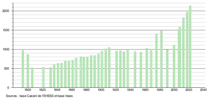 L'évolution du nombre d'habitants est connue à travers les recensements de la population effectués dans la commune depuis 1793. Pour les communes de moins de 10 000 habitants, une enquête de recensement portant sur toute la population est réalisée tous les cinq ans, les populations légales des années intermédiaires étant quant à elles estimées par interpolation ou extrapolation[22]. Pour la commune, le premier recensement exhaustif entrant dans le cadre du nouveau dispositif a été réalisé en 2007[23].
