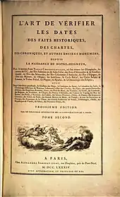 Le titre complet est « L'Art de vérifier les Dates ou faits historiques des chartes, des chroniques, et anciens monumens depuis la naissance de Jésus-Christ, par le moyen d'une table chronologique, où l'on trouve les années de Jésus-Christ et de l'Ere d'Espagne, les Indictions, le Cycle pascal, les Pâques de chaque année, les Cycles solaires et lunaires. Avec un Calendrier perpétuel, l'Histoire abrégée des conciles, des papes, des empereurs romains, grecs, français, allemands et turcs ; des rois de France, d'Espagne et d'Angleterre, d'Écosse, de Lombardie, de Sicile, de Jérusalem, etc., des ducs de Bourgogne, de Normandie, de Bretagne ; des Comtes de Toulouse, de Champagne et de Blois par des religieux bénédictins de la congrégation de Saint Maur ».